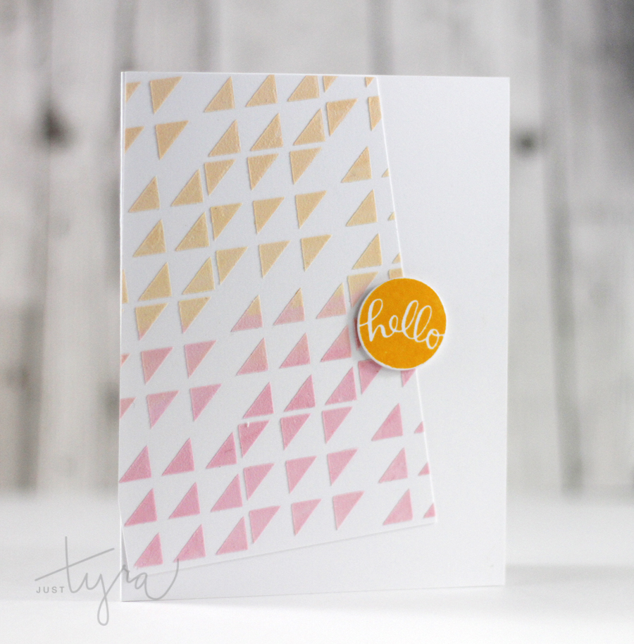 I used embossing paste + spray inks from Mr. Hueys to create the pattern on the card. I cut the mat at an angle and matted it onto the card. The “hello” sentiment is from the latest Simon Says Stamp card kit. I’m playing along with the Simon Says Anything Goes Challenge. As always, thanks so much for stopping by! Tyra 🙂