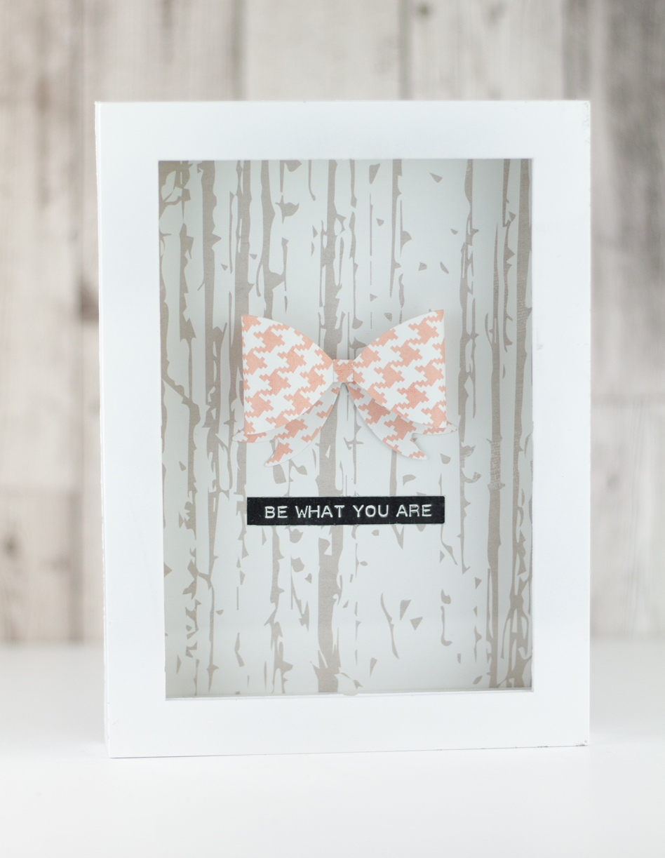 3. For my last project, I created a shadow box featuring the beautiful bow die in a pretty pink pattern that contrasts well with the gray and white neutral background.